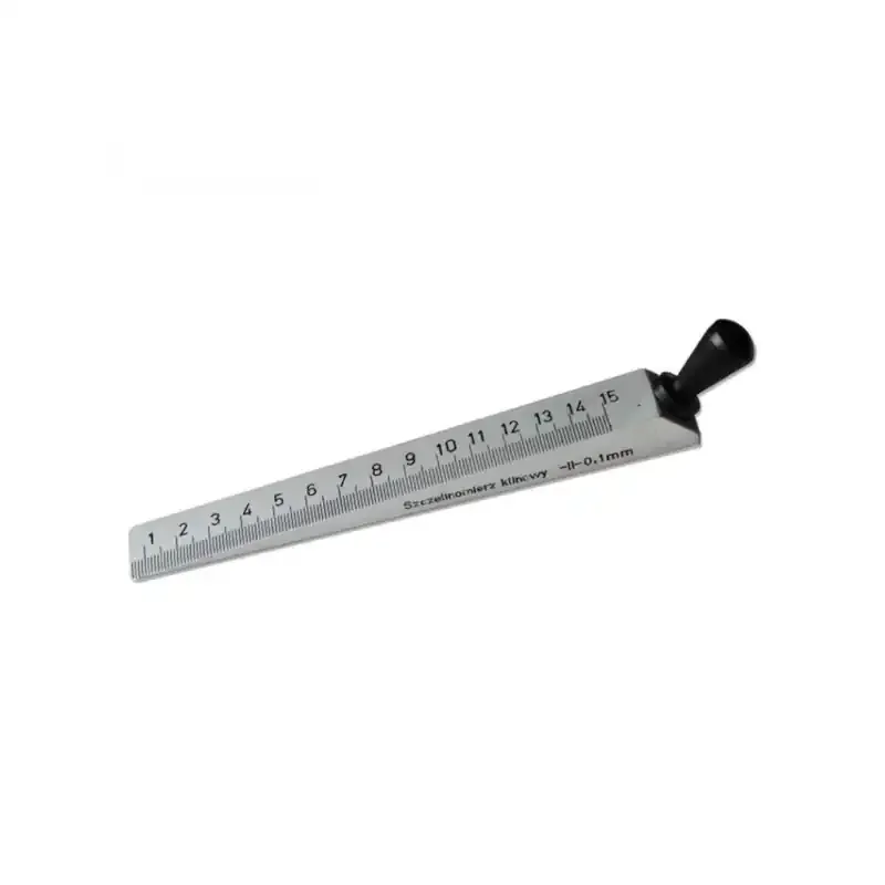 Szczelinomierz klinowy 150 mm SŁOWIK – precyzyjne narzędzie do pomiaru szczelin i luzów. Wykonany z aluminium, posiada podział milimetrowy z dokładnością 0,1 mm. Idealny dla budowlańców i geodetów.