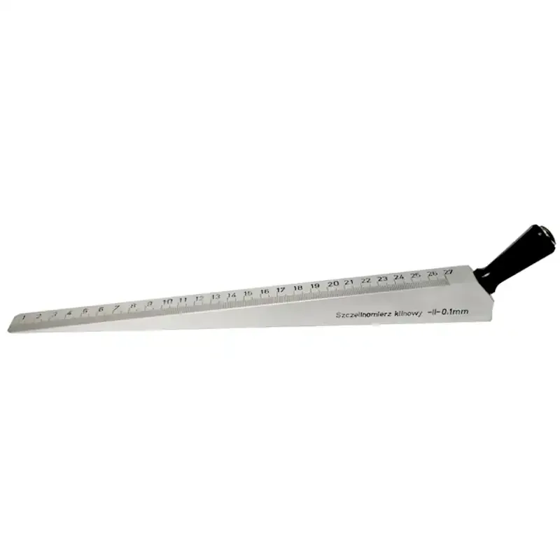 Szczelinomierz klinowy 270 mm (duży) – precyzyjne narzędzie do pomiaru szczelin i luzów. Wykonany z aluminium, posiada podział milimetrowy z dokładnością 0,1 mm. Idealny dla budowlańców i geodetów.