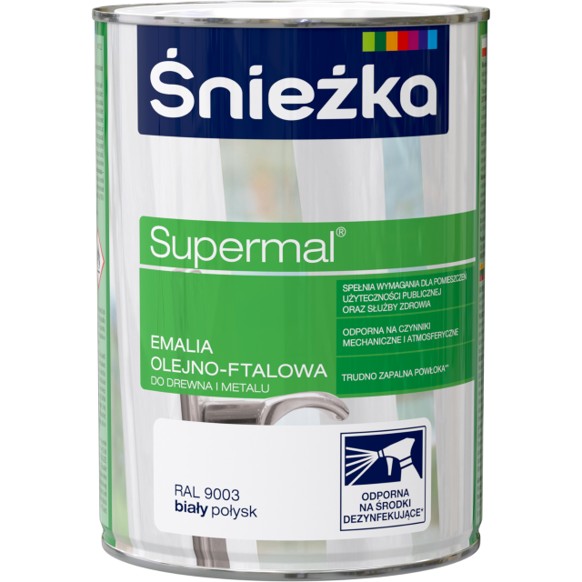 SUPERMAL Emalia olejno-ftalowa stosowana jest do dekoracyjno-ochronnego malowania drewna, materiałów drewnopochodnych, tynków oraz elementów stalowych i żeliwnych użytkowanych wewnątrz i na zewnątrz pomieszczeń, takich jak: okna, drzwi, meble, ogrodzenia, lamperie itp. Polecana do stosowania w pomieszczeniach mieszkalnych, przeznaczonych na stały pobyt chorych w budynkach służby zdrowia oraz przeznaczonych na stały pobyt dzieci i młodzieży w budynkach oświaty, a także w pomieszczeniach przeznaczonych do przechowywania produktów żywnościowych (bez bezpośredniego kontaktu z żywnością).