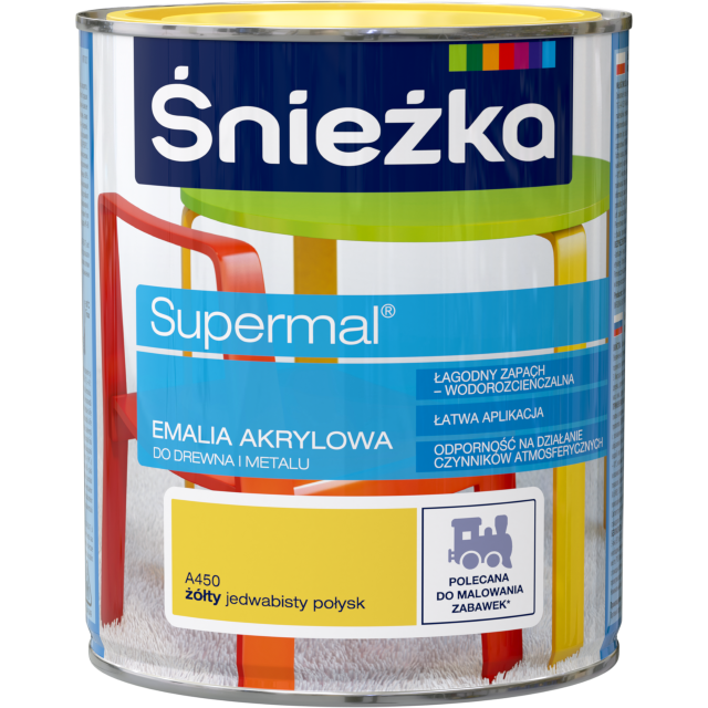Emalia akrylowa ŚNIEŻKA SUPERMAL Universal w kolorze żółty jedwabisty połysk przeznaczona jest do malowania powierzchni drewnianych i metalowych wewnątrz i na zewnątrz. Produkt dobrze przywiera do nowych i wcześniej malowanych podłoży. Tworzy trwałą, odporną na ścieranie i działanie czynników atmosferycznych powłokę. Farba łatwo się aplikuje pędzlem, wałkiem lub natryskiem, szybko schnie i zapewnia jednolite, estetyczne wykończenie z delikatnym połyskiem.