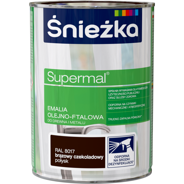 Emalia olejno‑ftalowa ŚNIEŻKA SUPERMAL w kolorze brązowy czekoladowy połysk przeznaczona jest do dekoracyjnego i ochronnego malowania powierzchni wewnętrznych i zewnętrznych. Produkt dobrze przywiera do drewna, metalu oraz powierzchni wcześniej malowanych. Tworzy trwałą, odporną na ścieranie i warunki atmosferyczne powłokę. Farba jest łatwa w aplikacji pędzlem, wałkiem lub natryskiem, szybko schnie i pozwala uzyskać równomierny, estetyczny połysk.