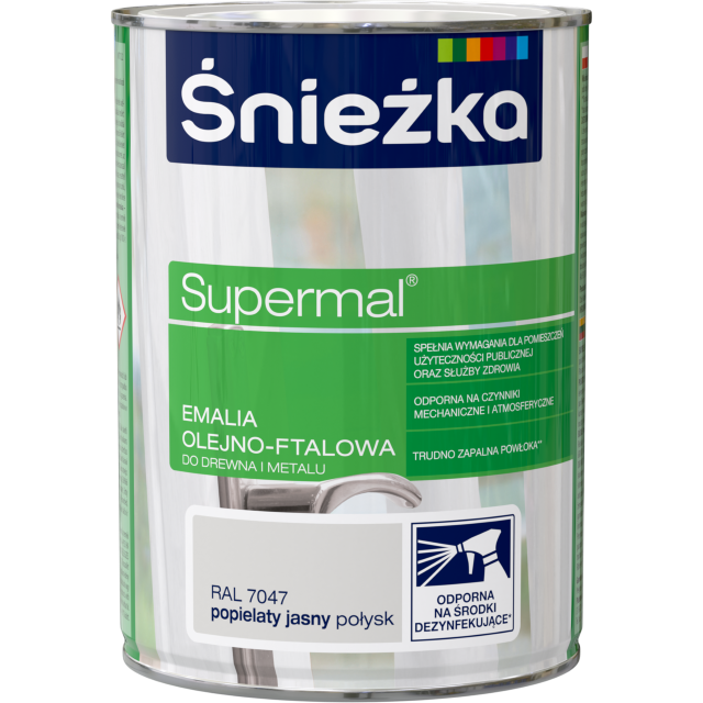 Emalia olejno‑ftalowa ŚNIEŻKA SUPERMAL w kolorze popielaty jasny połysk przeznaczona jest do malowania powierzchni wewnętrznych i zewnętrznych. Produkt dobrze przywiera do drewna, metalu oraz powierzchni wcześniej malowanych. Tworzy trwałą, odporną na ścieranie i działanie czynników atmosferycznych powłokę. Farba jest łatwa w aplikacji pędzlem, wałkiem lub natryskiem, szybko schnie i zapewnia jednolite, estetyczne wykończenie z połyskiem.
