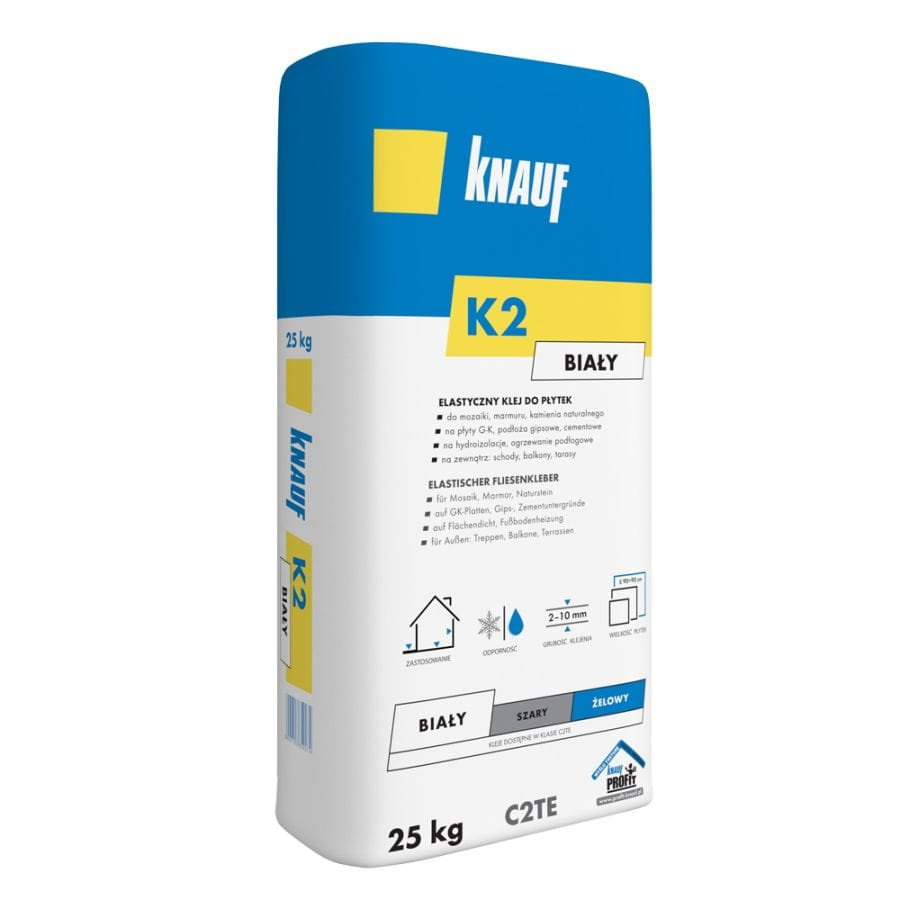 Elastyczny klej do płytek Knauf K2 w kolorze biały to sucha zaprawa przeznaczona do mocowania okładzin ceramicznych, gresowych i kamiennych na ścianach i podłogach wewnątrz i (zgodnie z zaleceniami producenta) w standardowych zastosowaniach zewnętrznych. Dzięki modyfikowanym spoiwom i dodatkom plastycznym klej wykazuje dobrą elastyczność, co poprawia odporność na mikro-ruchy podłoża i minimalizuje ryzyko pęknięć spoin. Po przygotowaniu z wodą tworzy masę o dobrej przyczepności i roboczości.