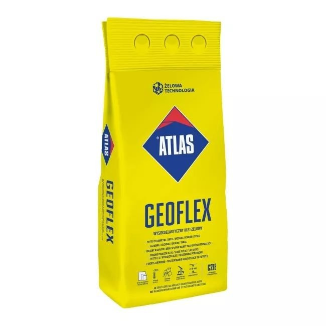 ATLAS GEOFLEX to klej żelowy, który łączy elastyczność i trwałość, a jednocześnie ułatwia pracę. Dzięki nowoczesnej technologii żelu krzemianowego zapewnia maksymalną przyczepność, pełny rozpływ oraz łatwą aplikację. Ponadto jest skuteczny na trudnych podłożach, przy wysokich temperaturach oraz przy dużych formatach płytek, co sprawia, że jest idealnym wyborem do profesjonalnych i domowych zastosowań.