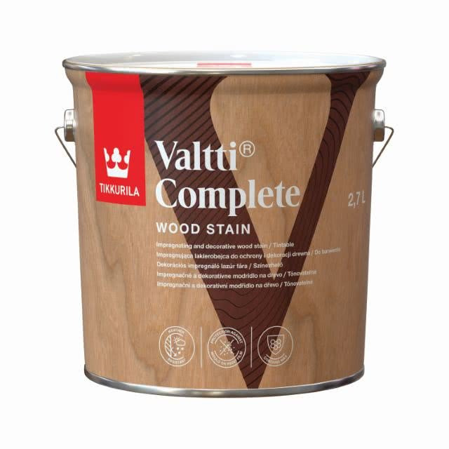 Tikkurila Valtti Complete 2,7 l to impregnująco-dekorująca lakierobejca przeznaczona do ochrony i dekoracji drewna na zewnątrz budynków. Produkt łączy właściwości impregnatu oraz powłoki wykończeniowej, zapewniając skuteczną ochronę drewna przed wilgocią, promieniowaniem UV oraz zmiennymi warunkami atmosferycznymi. Lakierobejca sprawdza się przy malowaniu elewacji drewnianych, ogrodzeń, altan, pergoli oraz innych elementów architektury ogrodowej. Preparat podkreśla naturalną strukturę drewna i nadaje mu estetyczny wygląd. Kolor dobierzesz w naszym mieszalniku zgodnie z wybranym WZORNIKIEM, co pozwala dopasować odcień do projektu.