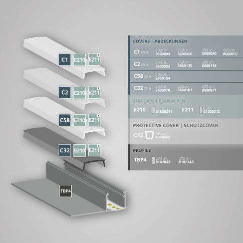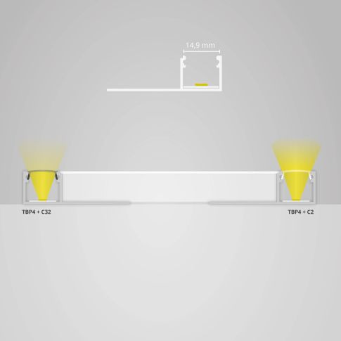 Profil końcowy do suchej zabudowy TBP4 do taśm LED o maksymalnej szerokości 14 mm. Płaski standardowy klosz profilu wykonany z nietłukącego, trudnopalnego poliweglanu zapewnia jednorodną, nieoślepiającą linię światła i jest dostępna w róznych wersjach. Profil może być montowany poziomo i pionowo z płytami gipsowo-kartonowymi oraz, w razie potrzeby, wypełniany i tynkowany. Płyty gipsowo-kartonowe są zlicowane z profilem, dzięki czemu profil jest niewidoczny. Dostępna osłona ochronna C1S wielorazowego użytku.
