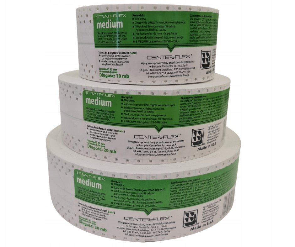 Taśma USA MEDIUM zielona 10 m to profesjonalna taśma wzmacniająca przeznaczona do łączeń płyt gipsowo-kartonowych w systemach suchej zabudowy. Produkt umożliwia wykonywanie trwałych, równych i odpornych na pęknięcia spoin na połączeniach płyt gk. Taśma sprawdza się szczególnie przy wzmacnianiu połączeń płaskich oraz narożników wewnętrznych, gdzie wymagana jest wysoka stabilność i precyzja wykonania. Specjalna konstrukcja zapewnia dobre dopasowanie do podłoża oraz łatwą współpracę z masami szpachlowymi. Taśma MEDIUM ogranicza ryzyko powstawania rys i pęknięć, zwiększając trwałość wykończenia powierzchni.