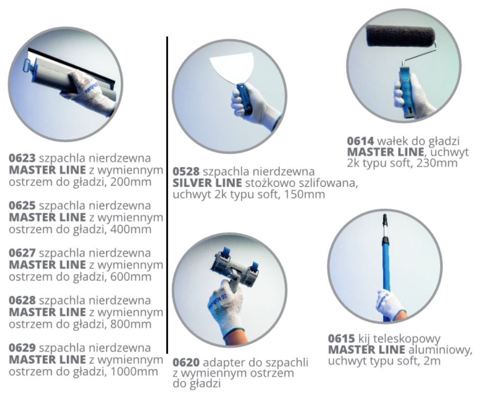 Zestaw umożliwia szybkie i precyzyjne wykończenie powierzchni gładzi, zapewniając estetyczny efekt i komfort pracy.