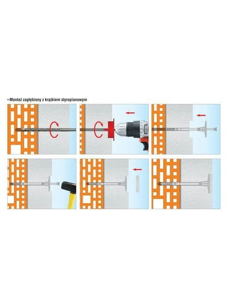 - Uniwersalny kołek do mocowania styropianu. Dzięki nowej konstrukcji strefy rozpierania łącznik może być montowany we wszystkich kategoriach podłoży. Specjalny trzpień tworzywowy wzmocniony włóknem szklanym. Krótka strefa rozporowa. Konstrukcja główka trzpienia ułatwia montaż, uszczelnia połączenie trzpień koszulka łącznika. Konstrukcja koszulki zwiększa sztywność kołnierza dociskowego.