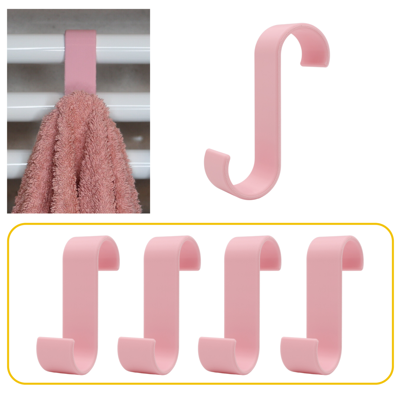 Zestaw 4 stylowych wieszaków łazienkowych na okrągły kaloryfer w kolorze różowym.Haczyki bezinwazyjne pozwolą uporządkować Twoją łazienkę bez konieczności przyklejania ich i wiercenia w ścianie. Powieś wieszak na swoim kaloryferze i ciesz się wygodą i funkcjonalnością w swojej łazience.