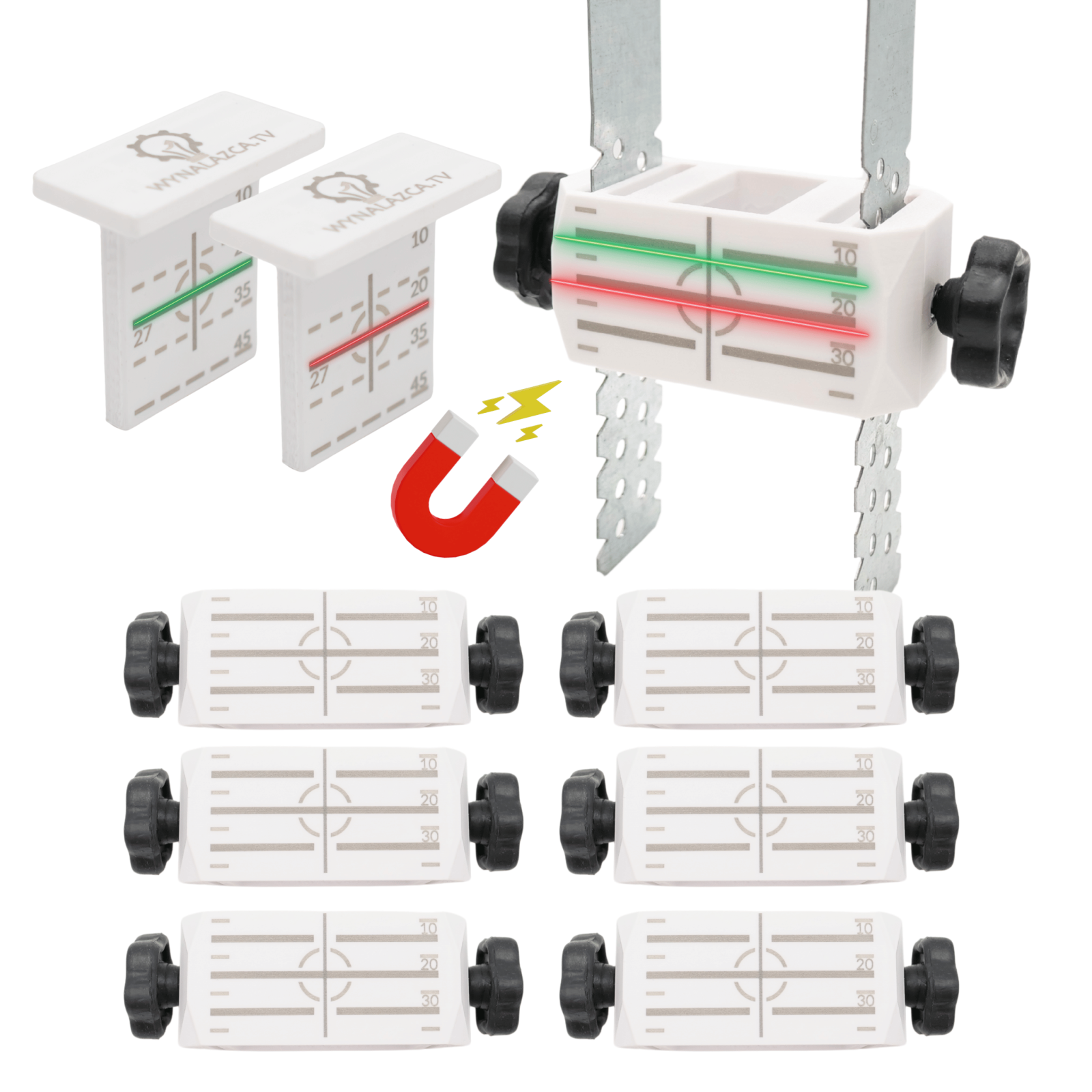 Specyfikacja: 6 sztuki uchwytów do poziomowania 2 sztuka znacznika na magnes Dwustronna podziałka Celownik poziomy i pionowy Ciemna podziałka i liczby Kolor biały Mocne magnesy Wykonany z lekkiego tworzywa