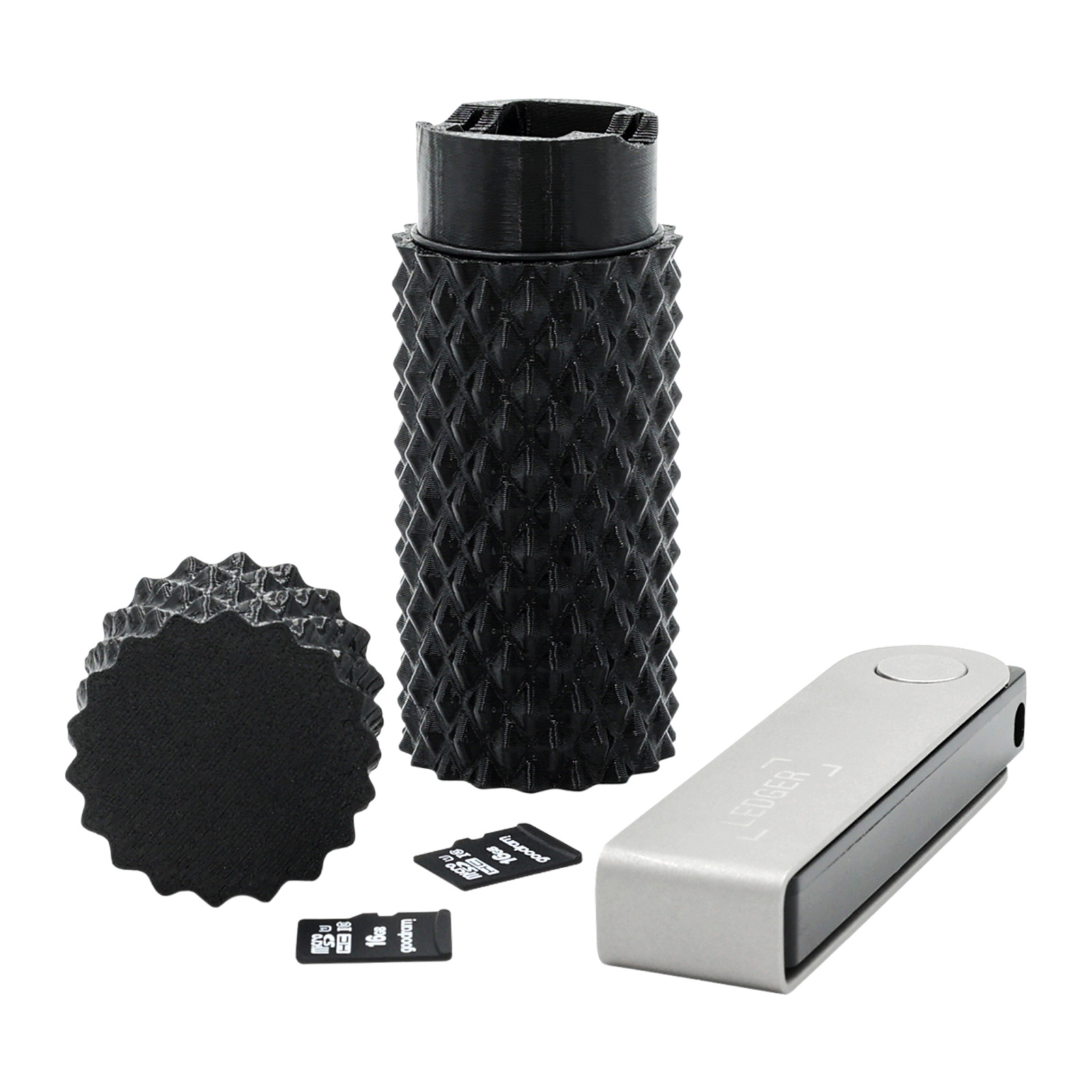 Bezpieczny schowek - etui na Ledger Nano X - na Twoje kryptowaluty, zapewni doskonałą ochronę podczas przechowywania portfela i innych akcesoriów. Etui zabezpieczy Twój Ledger przez wilgocią oraz uszkodzeniami mechanicznymi. W etui mieści się: – Ledger Nano X – 2x karta microSD