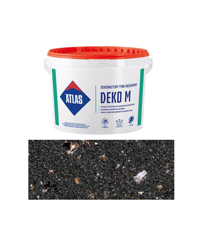 Dekoracyjny tynk mozaikowy ATLAS DEKO M to cienkowarstwowa wyprawa tynkarska przeznaczona do estetycznego i trwałego wykończenia zarówno elewacji, jak i wnętrz. Produkt składa się z nowoczesnej bazy akrylowej z dodatkami hydrofobizującymi oraz specjalnie dobranych kruszyw kwarcowych barwionych. Dzięki czemu tworzy efekt naturalnej mozaiki o wysokiej odporności na zmywanie, zabrudzenia i uszkodzenia mechaniczne. Tynk jest odporny na działanie warunków atmosferycznych i promieniowanie UV oraz kompensuje naprężenia termiczne, co sprawdza się w systemach ociepleń i na fasadach budynków.