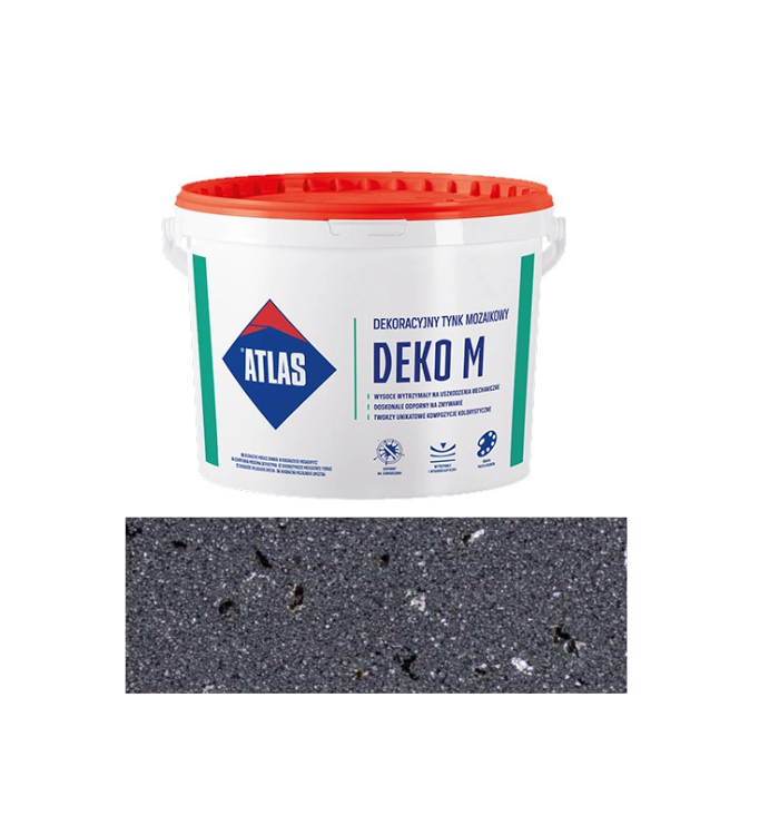 Dekoracyjny tynk mozaikowy ATLAS DEKO M to cienkowarstwowa wyprawa tynkarska przeznaczona do estetycznego i trwałego wykończenia zarówno elewacji, jak i wnętrz. Produkt składa się z nowoczesnej bazy akrylowej z dodatkami hydrofobizującymi oraz specjalnie dobranych kruszyw kwarcowych barwionych. Dzięki czemu tworzy efekt naturalnej mozaiki o wysokiej odporności na zmywanie, zabrudzenia i uszkodzenia mechaniczne. Tynk jest odporny na działanie warunków atmosferycznych i promieniowanie UV oraz kompensuje naprężenia termiczne, co sprawdza się w systemach ociepleń i na fasadach budynków.