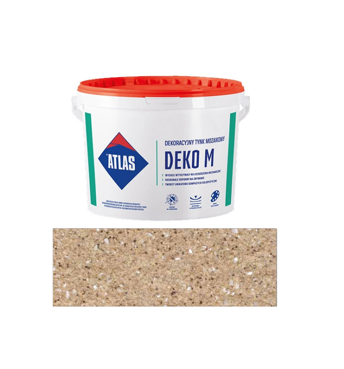 Dekoracyjny tynk mozaikowy ATLAS DEKO M to cienkowarstwowa wyprawa tynkarska przeznaczona do efektownego i trwałego wykończenia elewacji oraz ścian wewnętrznych. Dzięki akrylowej bazie z barwionymi kruszywami kwarcowymi produkt tworzy strukturę mozaikową o wyraźnej teksturze i naturalnym wyglądzie. Tynk charakteryzuje się wysoką odpornością na zabrudzenia, warunki atmosferyczne i promieniowanie UV, co sprawdza się zarówno w systemach ociepleń, jak i na fasadach budynków. Zastosowanie odpowiednich dodatków hydrofobowych zwiększa jego trwałość i ułatwia utrzymanie czystości.