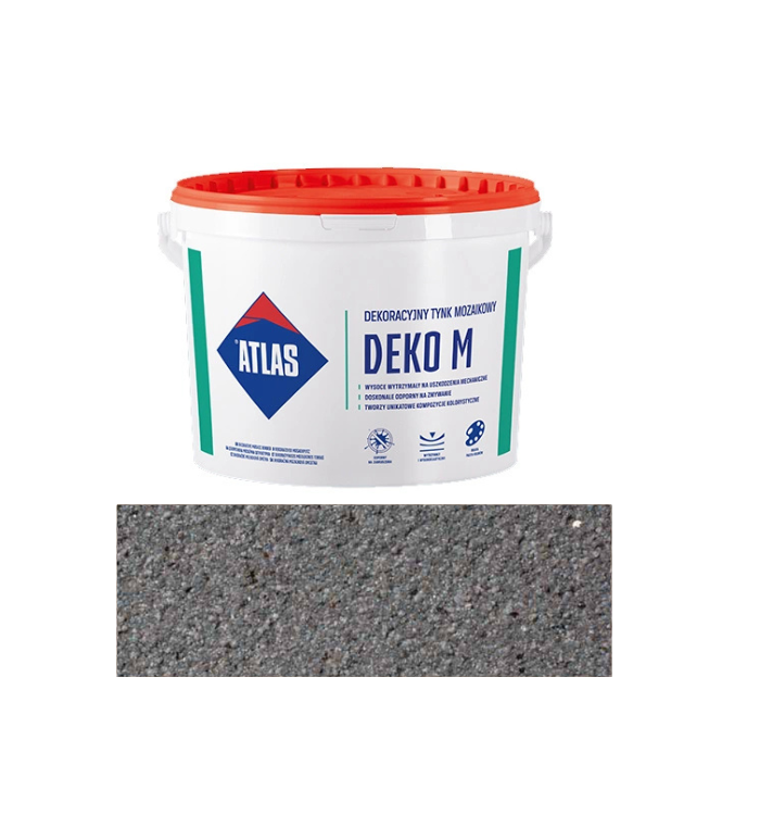 Dekoracyjny tynk mozaikowy ATLAS DEKO M to cienkowarstwowa wyprawa tynkarska przeznaczona do efektownego i trwałego wykończenia elewacji oraz ścian wewnętrznych. Dzięki akrylowej bazie z barwionymi kruszywami kwarcowymi produkt tworzy strukturę mozaikową o wyraźnej teksturze i naturalnym wyglądzie. Tynk charakteryzuje się wysoką odpornością na zabrudzenia, warunki atmosferyczne i promieniowanie UV, co sprawdza się zarówno w systemach ociepleń, jak i na fasadach budynków. Zastosowanie odpowiednich dodatków hydrofobowych zwiększa jego trwałość i ułatwia utrzymanie czystości.
