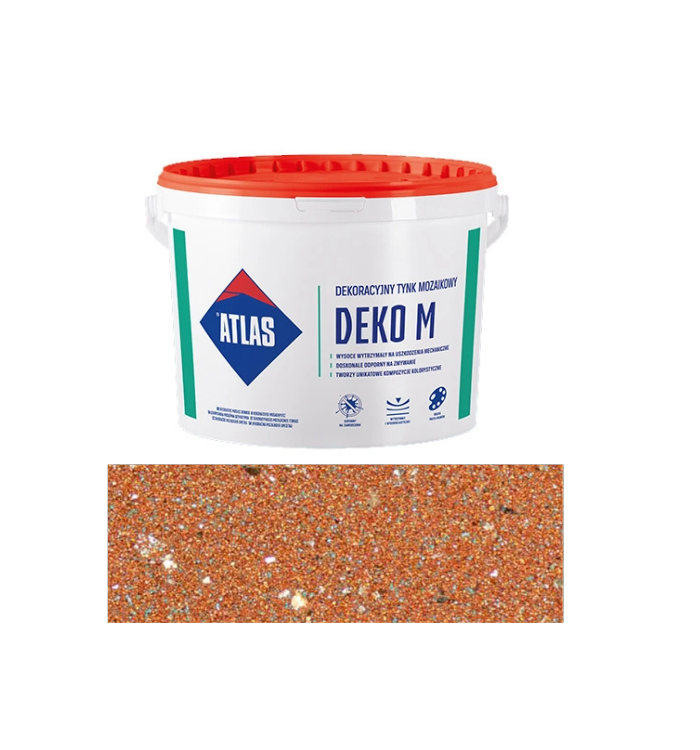 Dekoracyjny tynk mozaikowy ATLAS DEKO M to cienkowarstwowa wyprawa tynkarska przeznaczona do estetycznego, trwałego wykończenia elewacji oraz ścian wewnętrznych. Produkt oparty na akrylowej bazie z barwionymi kruszywami kwarcowymi tworzy strukturę mozaikową o naturalnym wyglądzie i subtelnej fakturze. Dzięki dodatkom hydrofobowym tynk wykazuje odporność na zabrudzenia i warunki atmosferyczne oraz promieniowanie UV, co sprawdza się zarówno w systemach ociepleń, jak i na fasadach budynków. Jego dekoracyjna powierzchnia nadaje charakteru nowoczesnym i klasycznym elewacjom.