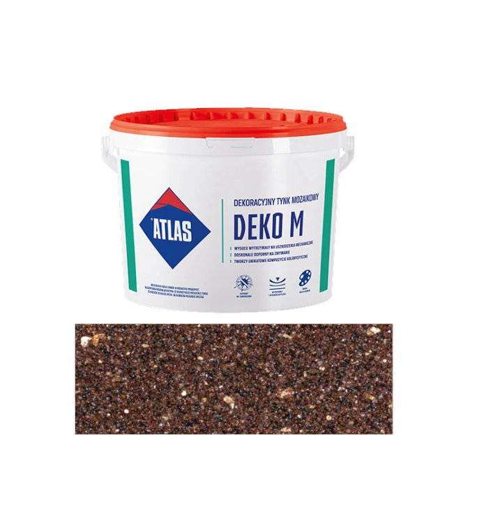 Dekoracyjny tynk mozaikowy ATLAS DEKO M to cienkowarstwowa wyprawa tynkarska przeznaczona do estetycznego, trwałego wykończenia elewacji oraz ścian wewnętrznych. Produkt oparty na akrylowej bazie z barwionymi kruszywami kwarcowymi tworzy strukturę mozaikową o naturalnym wyglądzie i subtelnej fakturze. Dzięki dodatkom hydrofobowym tynk wykazuje odporność na zabrudzenia i warunki atmosferyczne oraz promieniowanie UV, co sprawdza się zarówno w systemach ociepleń, jak i na fasadach budynków. Jego dekoracyjna powierzchnia nadaje charakteru nowoczesnym i klasycznym elewacjom.
